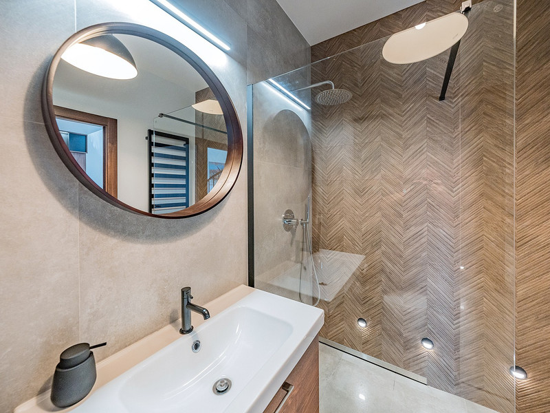 - łazienka, w której znajduje się wygodny przestronny prysznic, umywalka, duża szafa na ręczniki i akcesoria a w niej dodatkowo pralko-suszarka,