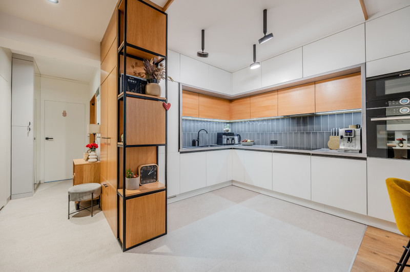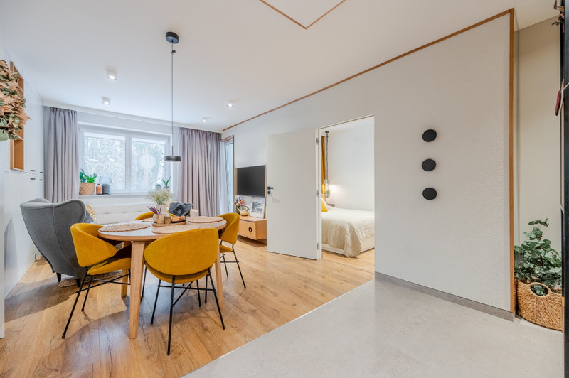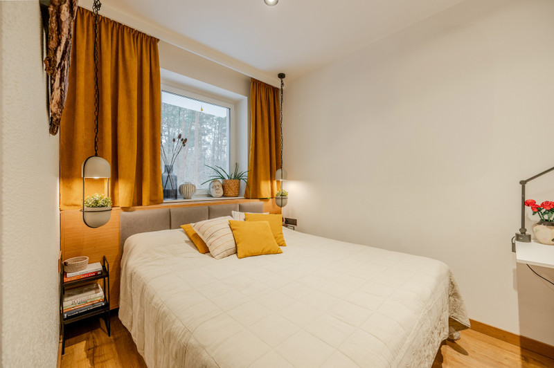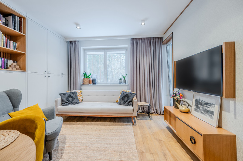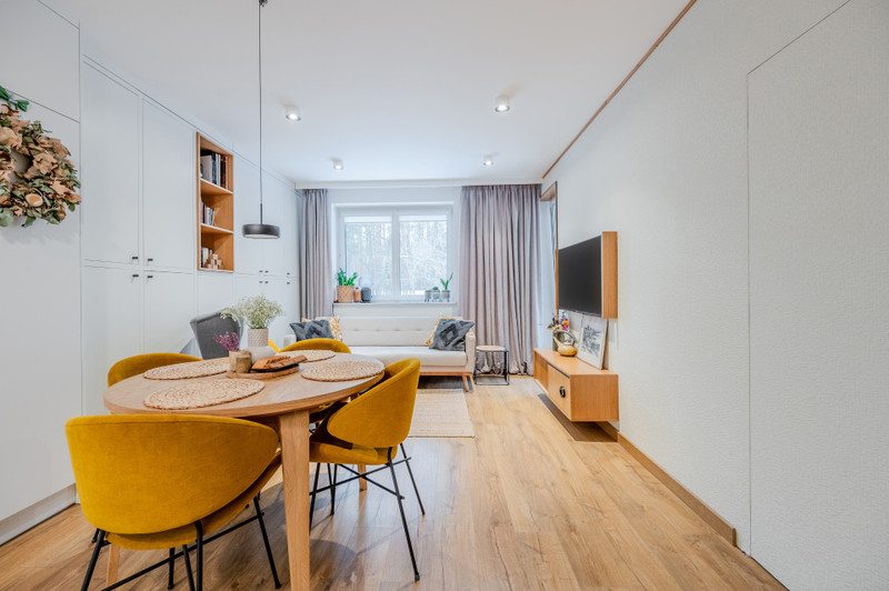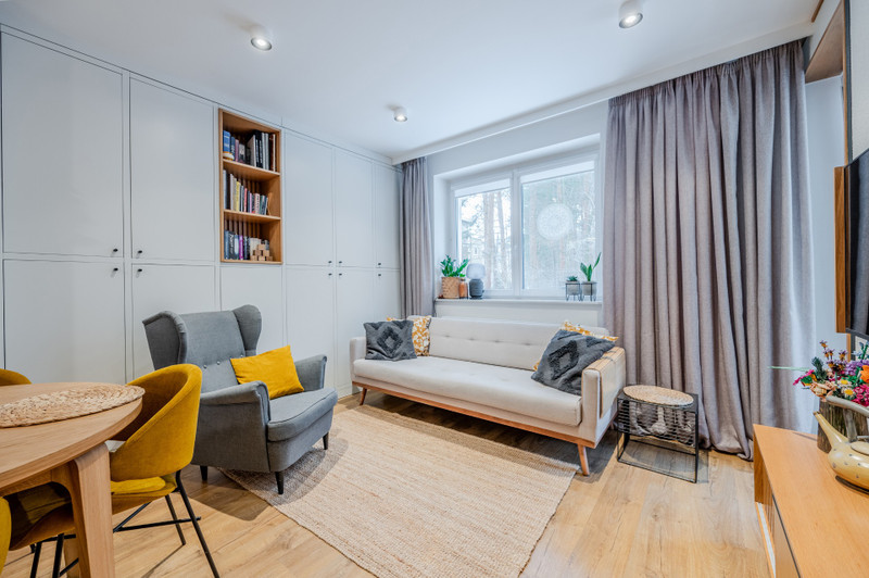 Mieszkanie znajduje się na wysokim parterze trzypiętrowego budynku. Przeszło gruntowny remont, podczas którego wymieniono wszystkie instalacje oraz okna. Wnętrze zostało w pełni zabudowane meblami wykonanymi na zamówienie przez stolarza, a cały proces remontu nadzorował architekt. Na podłodze położono gres oraz panele Quickstep w odcieniu naturalnego dębu. Całe wnętrze ma nowoczesny, ciepły i przytulny charakter. Od strony salonu i sypialni ściana lasu, co nadaje temu miejscu klimatu i poczucie spokoju. Dostęp do wspólnotowego ogródka ok 30m2. W cenie najmu jest komórka lokatorska w piwnicy. Media do zapłaty przez najemcę wg zużycia.