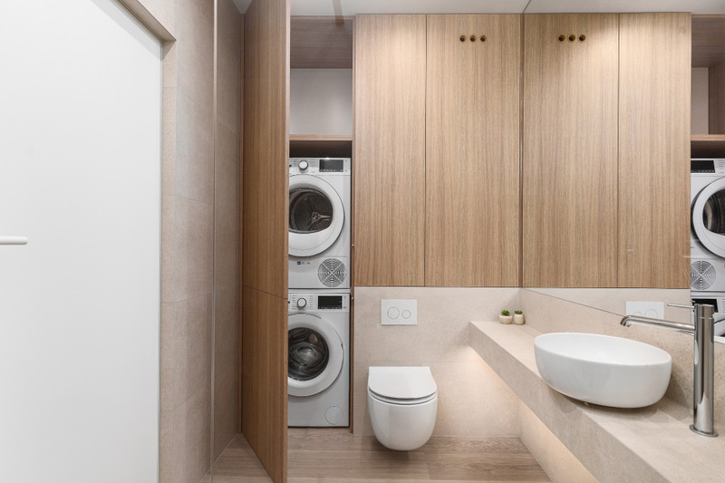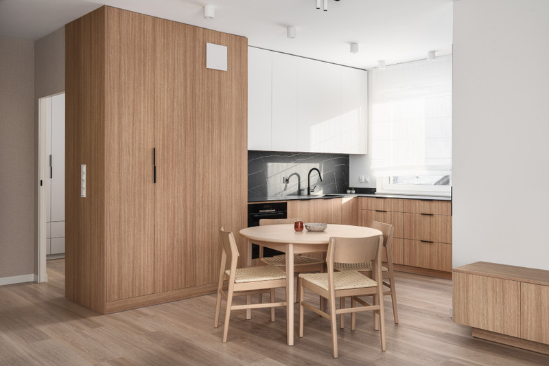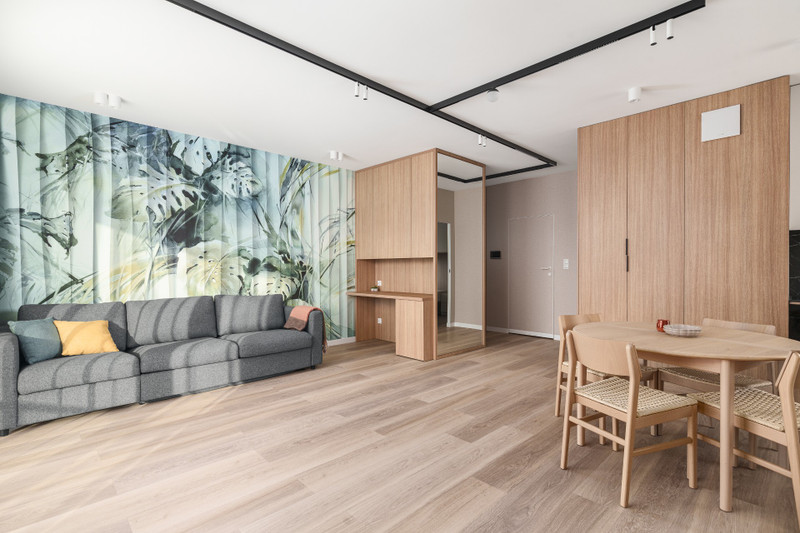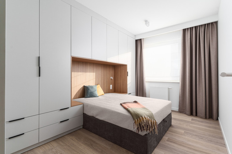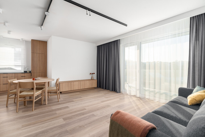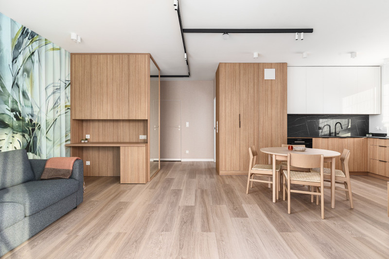 Apartament został wykończony w standardzie premium. Kuchnia i zabudowy stałe oferują dużo miejsca do przechowywania. Na wyposażeniu znajdują się sprzęty AGD, w tym zmywarka, pralka oraz suszark. Mieszkanie idealne dla singla lub pary.