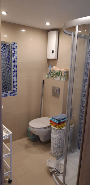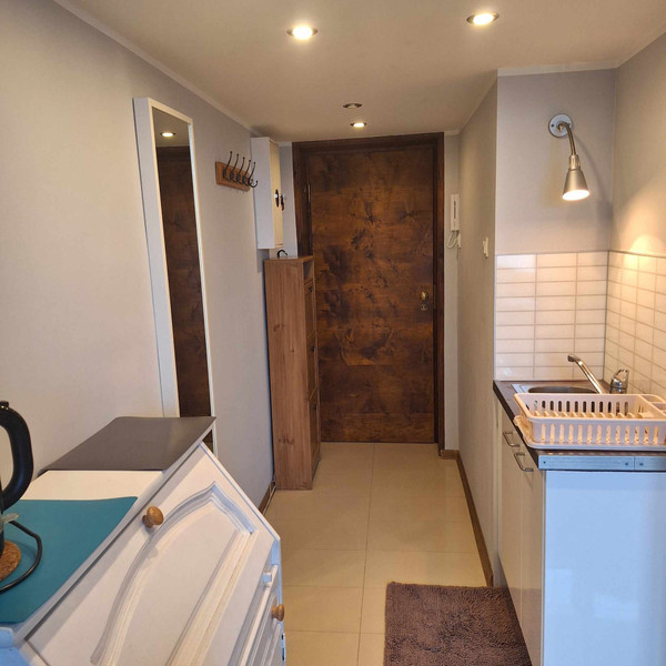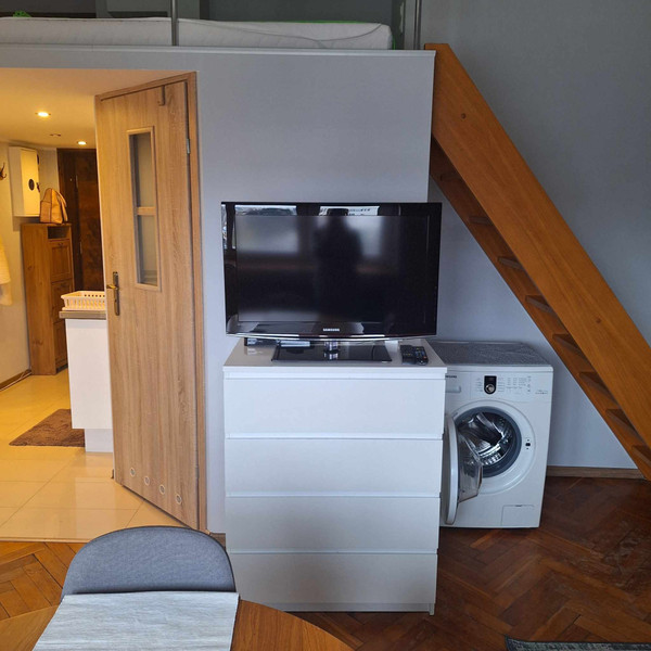 Pełne wyposażenie: czajnik elektryczny, niezbędne naczynia, lodówka, pralka, płyta indukcyjna.