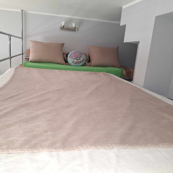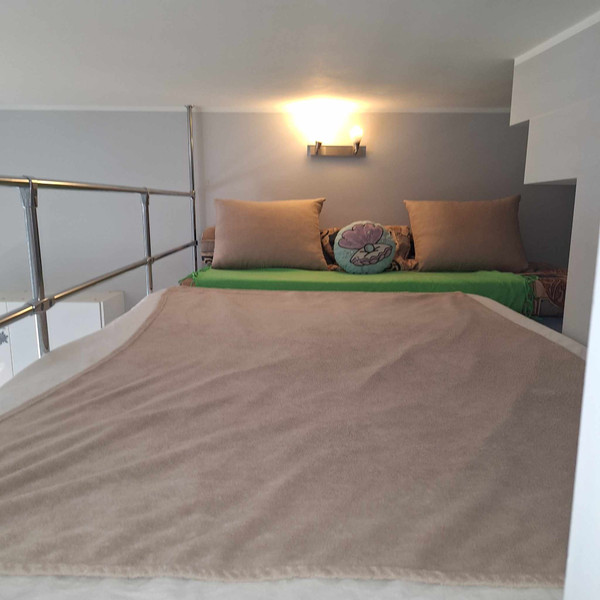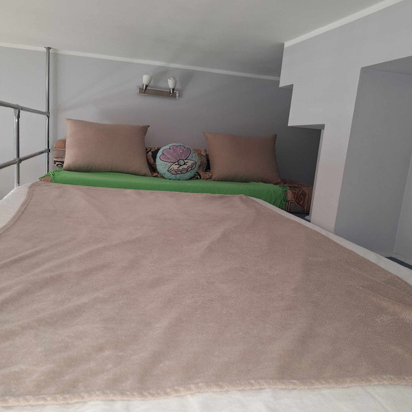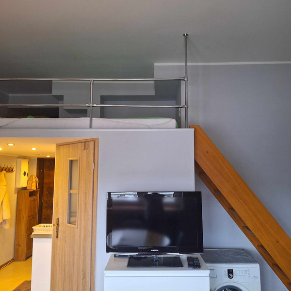 Salon z aneksem kuchennym i antresolą (dodatkowa przestrzeń do spania z 2 materacami). Łazienka z kabiną prysznicową.