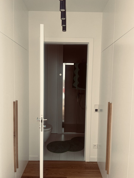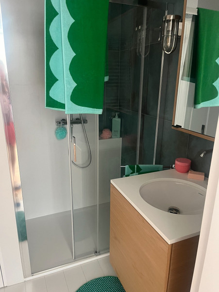 • Łazienka z prysznicem, wyposażoną w zabudowę wraz z pralką
