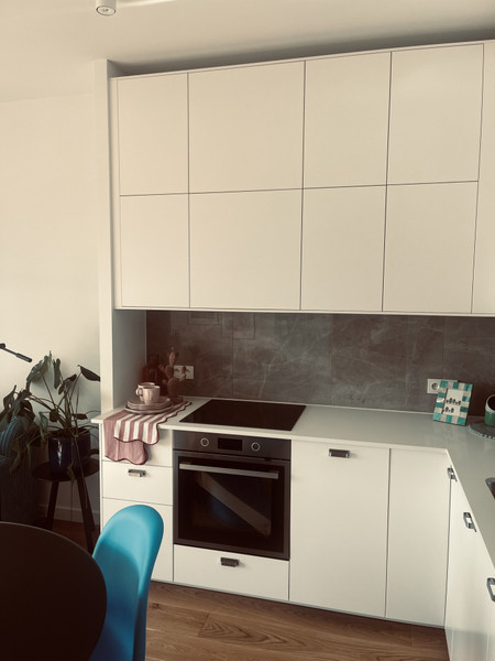 Apartament wyposażony jest w drewniane podłogi, zabudowę kuchenną i sprzęty AGD.
