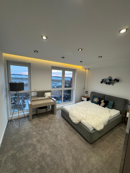 Mieszkanie wykończone w bardzo dobrym standardzie według indywidualnego projektu, w pełni wyposażone. W sypialniach na podłodze położona bardzo wysokiej klasy wykładzina dywanowa, w salonie, kuchni i przedpokoju panele podłogowe.