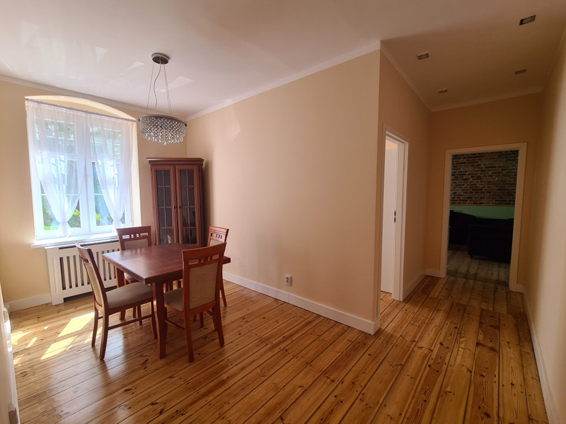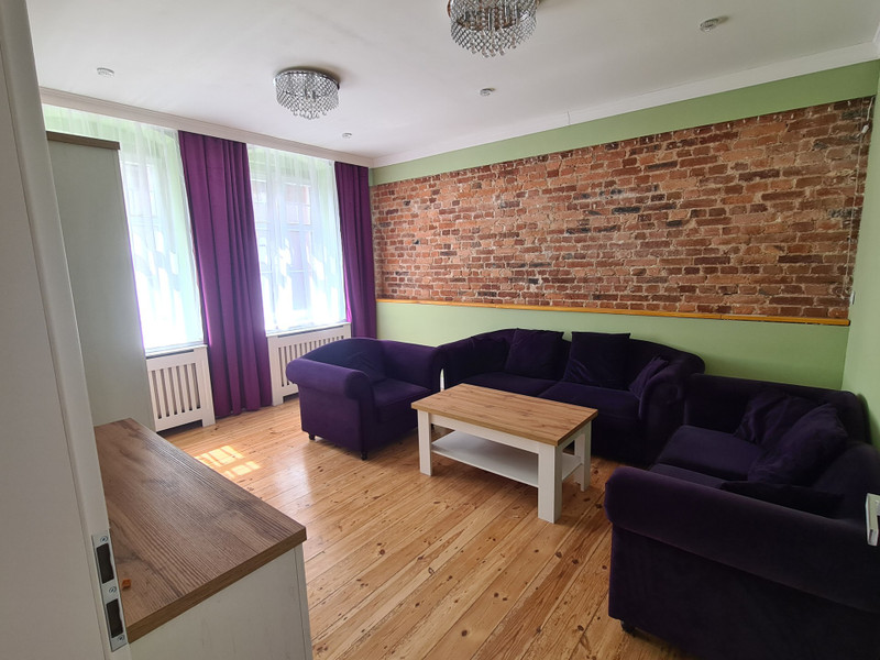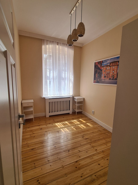 Mieści się na parterze w 3-piętrowym budynku. Ma powierzchnię 60m2 i składa się z trzech pokoi, widocznych na zdjęciach. Apartament w pełni wyposażony (kuchenka, piekarnik, lodówka, pralka, telewizor) i umeblowany (widoczne na załączonych zdjęciach). 50m do nikiszowskiego rynku.