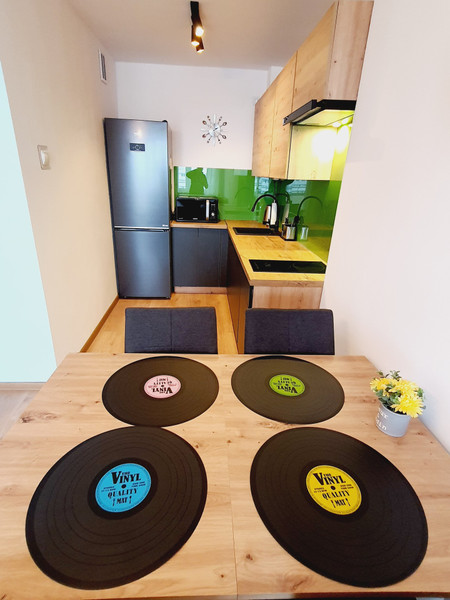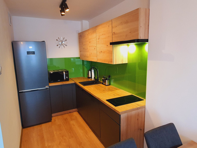 kuchnia – umeblowana, w pełni wyposażona w sprzęt AGD ( duża lodówka, zmywarka, mikrofala, płyta)