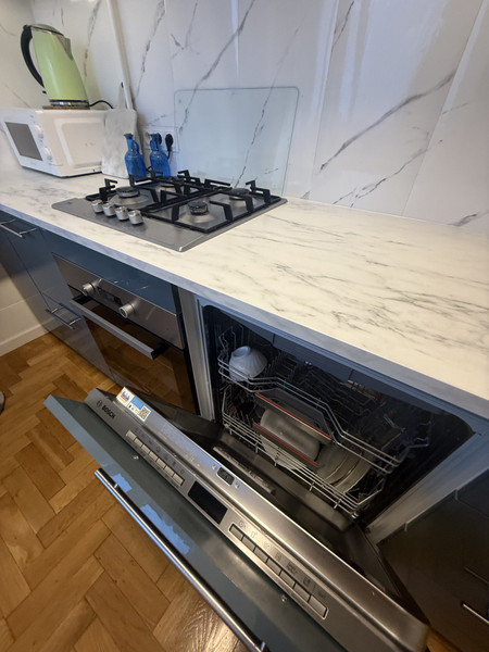 • Kuchnia - szafki z wyposażeniem, piecyk kuchenny, duża lodówka, nowa zmywarka, kuchenka mikrofalowa, czajnik elektryczny.