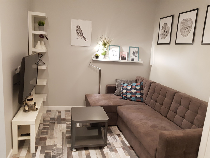 Pomieszczenia urządzone w nowoczesnym stylu. Funkcjonalność mieszkania zapewniają dwie szafy, meble kuchenne z wbudowaną lodówką oraz zmywarką Siemens, kanapa z funkcją spania 140 cm, telewizor 43 cale LG (m. in. SMART, WIFI, 4K), pralka Beko, oświetlenie LED. W skład wyposażenia wchodzą: naczynia, garnki, sztućce, czajnik, suszarka, deska do prasowania, odkurzacz itp.