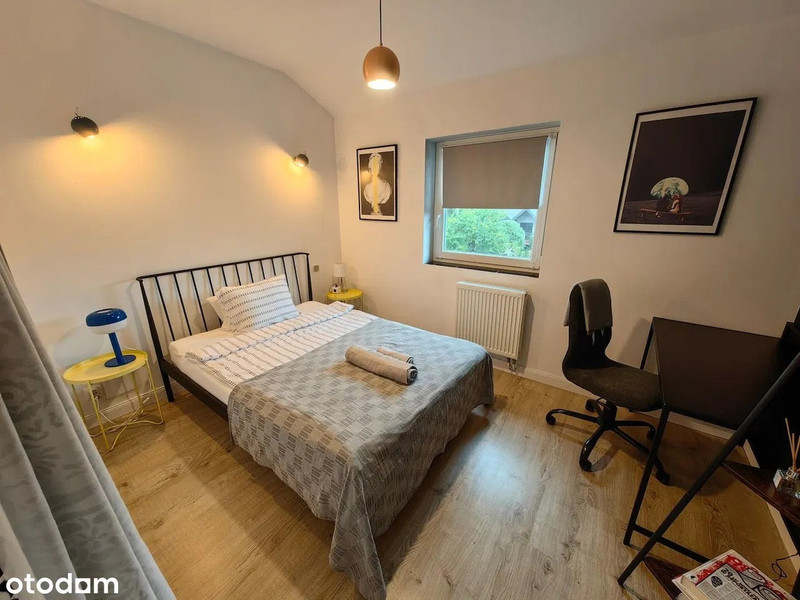 • Sypialnia: komfortowa przestrzeń z biurkiem do pracy i łóżkiem z wysokiej jakości materacem.