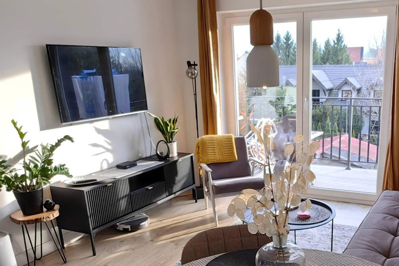• Salon: przestronny, klimatyzowany, z wygodną rozkładaną kanapą oraz wyjściem na duży balkon – idealny punkt do podziwiania wieczornych zachodów słońca.