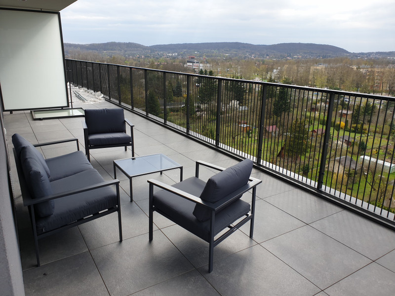 Apartament jest znacznie wyższy (h=280cm) niż pozostałe mieszkania w bloku. Do apartamentu przynależy 40 metrowy taras składający się z dwóch części w formie litery L tworzących jedną całość: część zachodnia i mniejsza północna. Taras wyposażony jest w wygodne meble tarasowe (sofa, fotele, stolik) aby cieszyć się zachodem słońca np. przy lampce ulubionego trunku. Apartament posiada nowoczesne instalacje inteligentnego zarządzania mieszkaniem FIBARO (sterowanie światłem, ogrzewaniem - zdalnie przez aplikację) oraz klimatyzację firmy TOSCHIBA z funkcją zarządzania przez aplikację a także BLUE BOLT (otwieranie bram wjazdowych, drzwi wejściowych, ściąganie windy bezdotykowo z poziomu aplikacji – przydatne w okresie pandemii). Dodatkowo w mieszkaniu jest internet WI-FI 600mb/s oraz telewizja naziemna i cyfrowa 99 kanałów.