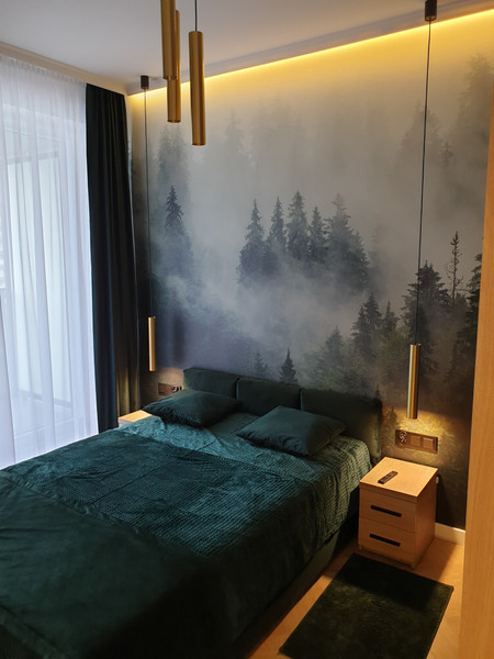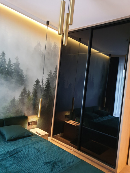 - Sypialnia z dwuosobowym łóżkiem, wyposażona w telewizor smart TV 43 cale oraz z pojemną szafą.