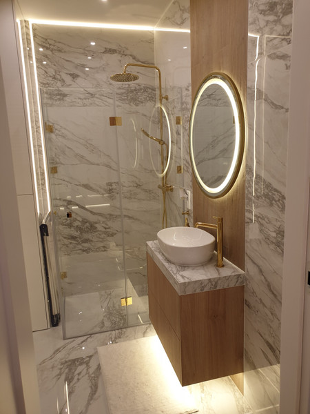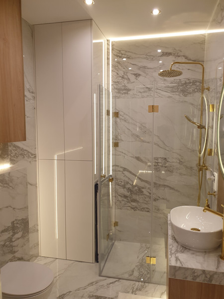 - Elegancka łazienka z prysznicem, wc, oraz z pralką i odkurzaczem Electrolux,