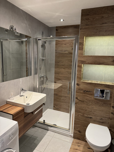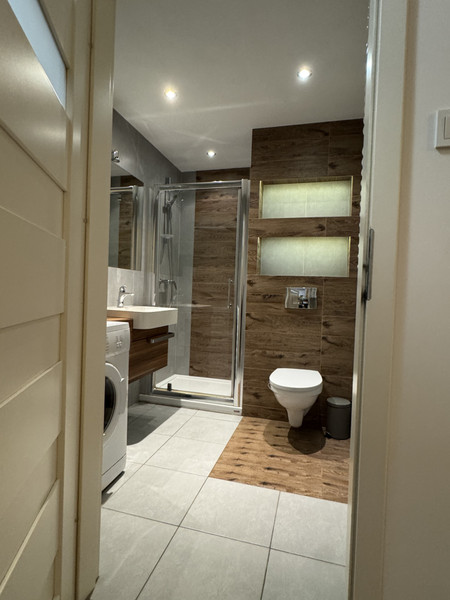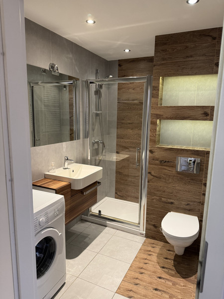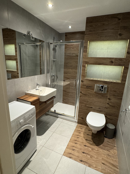 • Nowoczesna łazienka z przestronnym prysznicem, pralką