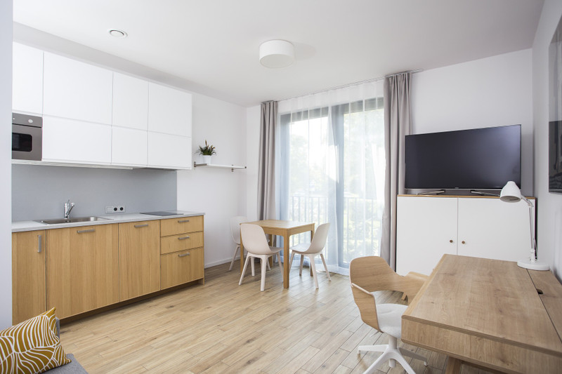 Apartament składa się z salonu, kuchni otwartej na salon, holu oraz łazienki. Apartament jest bardzo dobrze doświetlony.