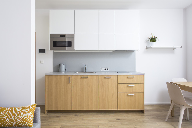 The apartment consists of a living room, a kitchen open to the living room and a bathroom. The apartment is very well lit.