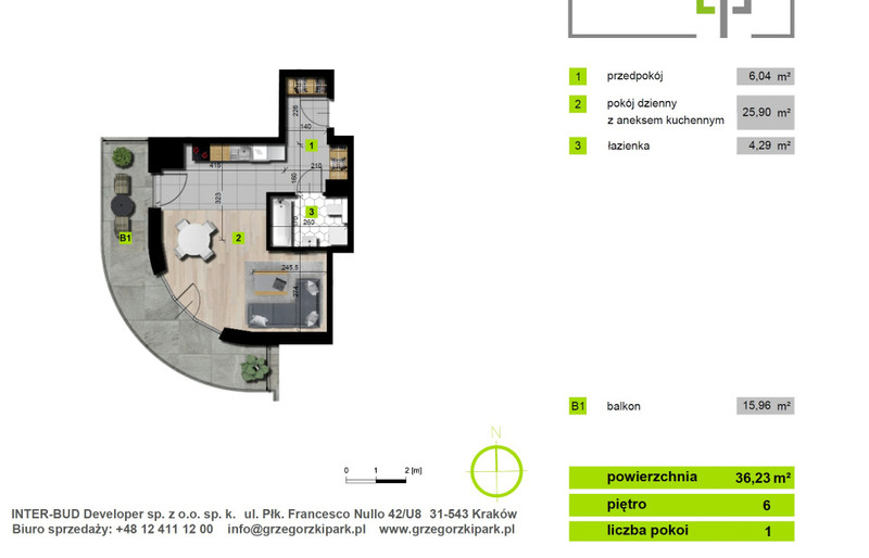 Mieszkanie znajduje się na 6-tym piętrze w nowym bloku na osiedlu Grzegórzki Park. Posiada przepiękny widok na panoramę Krakowa, widok w kierunku ogródków działkowych, niczym nie zasłonięty. Dodatkowo mieszkanie wyposażone jest w duży taras o powierzchni 16 m2.