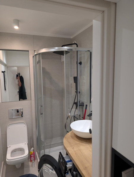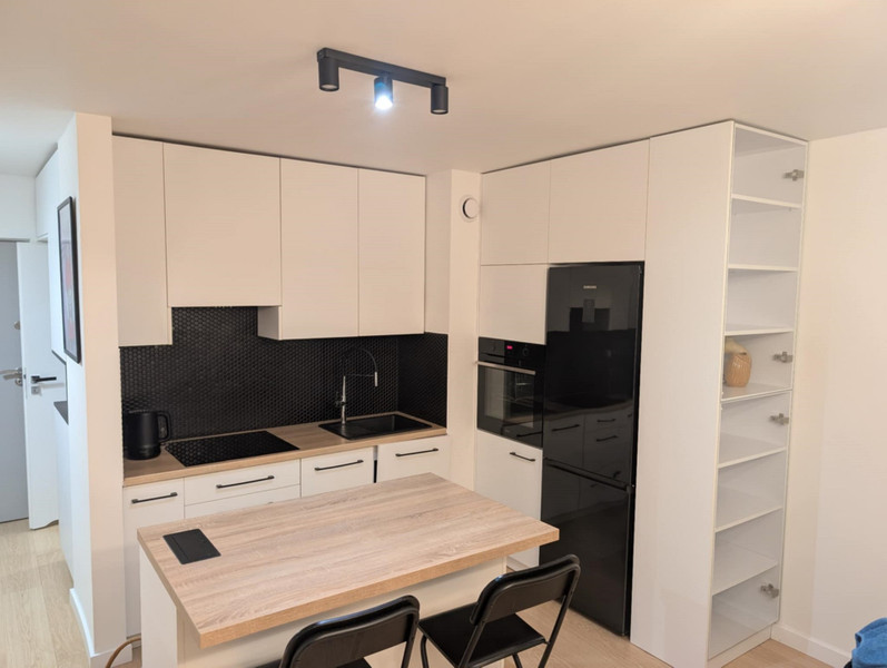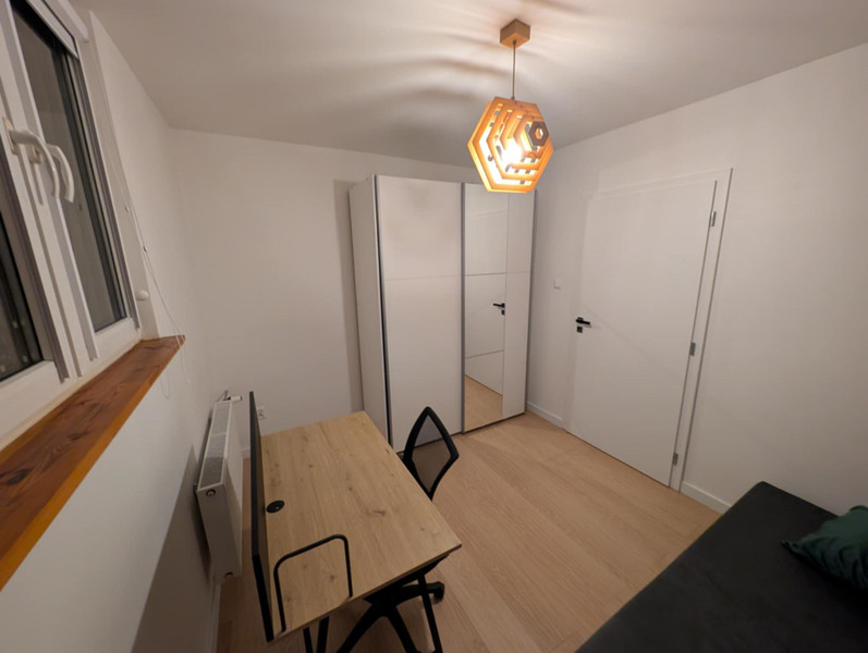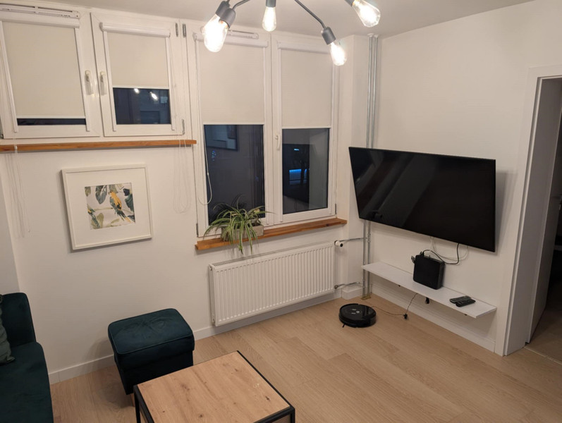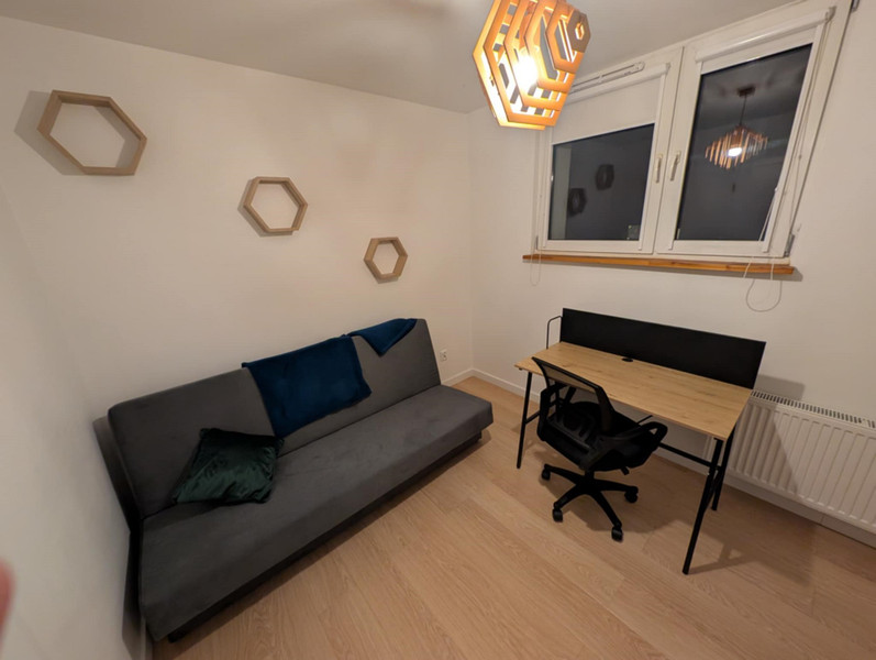 Powierzchnia 45 m2, w tym dwie nieprzechodnie sypialnie po około 10m2 (w każdej nowa kanapa, pojemna szafa, biurko i krzesło), salon z aneksem kuchennym zrobionym na wymiar z nowym wyposażeniem i wyspą (kanapa, TV, robot odkurzający, płyta indukcyjna, zmywarka, piekarnik, lodówka, czajnik), łazienka z prysznicem i pralką, w przedpokoju zabudowa na wymiar. Drzwi o dobrej jakości akustycznej oraz rolety wysokiej jakości.