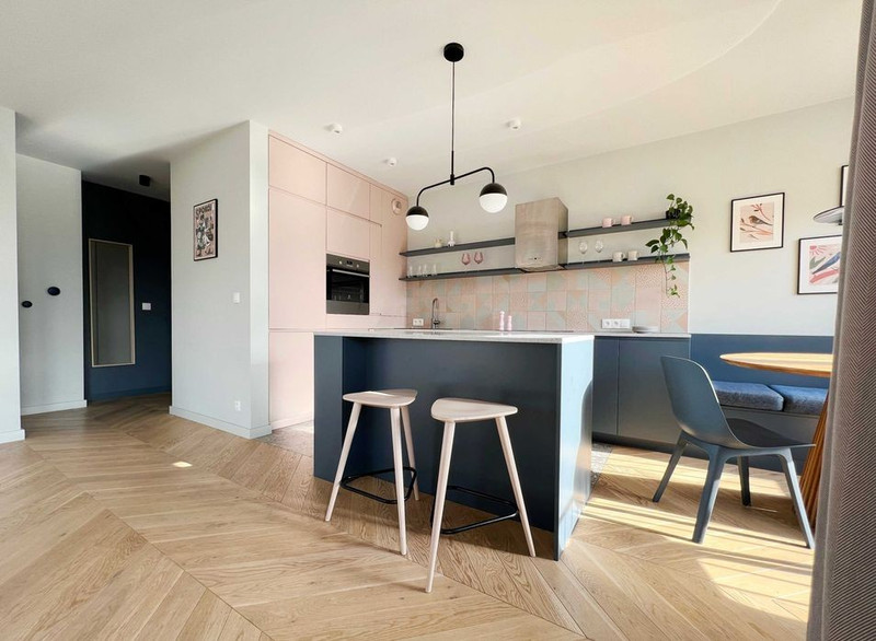 The apartment is equipped with air conditioning. The apartment consists of a living room with a kitchen with an island, a dining room with a round table, a separate bedroom with a double bed and a bathroom with a large shower. The living room is adjacent to a loggia. The apartment was designed by an interior designer, it has comfortable built-in furniture: a wardrobe in the bedroom, a washing machine in the entrance hall. In the kitchen there is a built-in dishwasher and fridge, sink, electric hob and oven in the column. The apartment is fully furnished, district heating provided by MPEC.