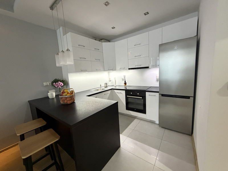 Aneks kuchenny wyposażony w piekarnik , płytę indukcyjną, zmywarkę i lodówkę.