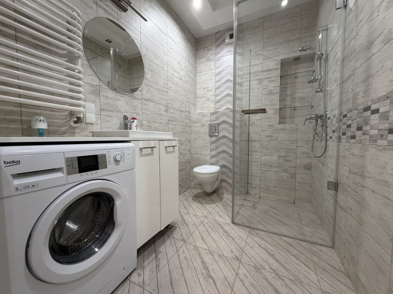 W łazience pralka.