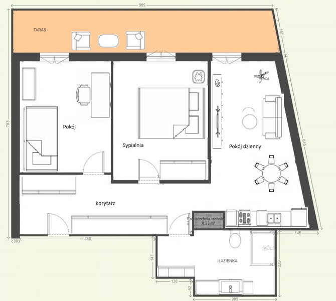 • 1. pokój. Pokój dzienny z aneksem kuchennym. Kuchnia i pokój są w pełni wyposażone.