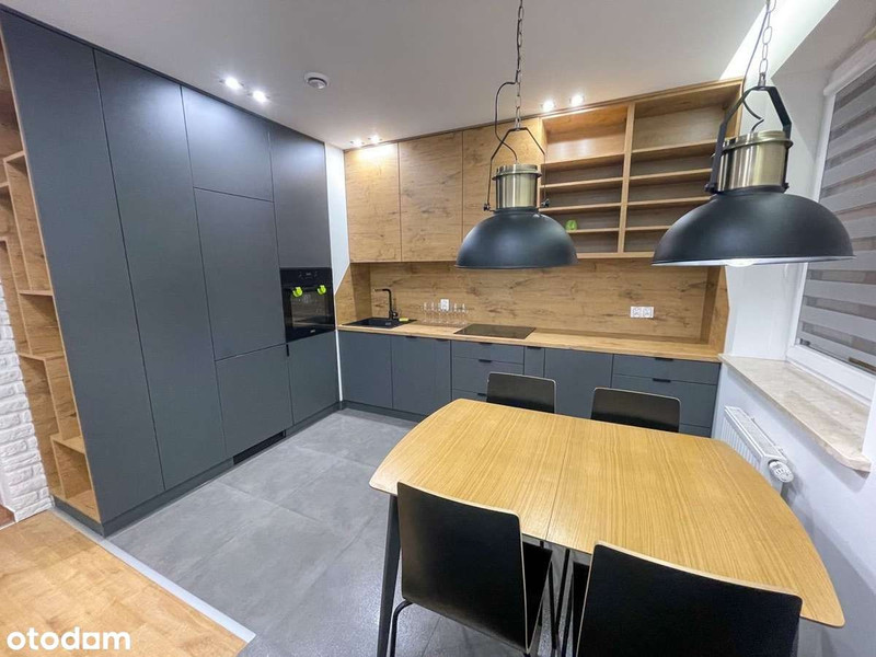 Kuchnia na wymiar z płyta indukcyjną, piekarnikiem i zmywarką. Całość dopełnia zabudowana duża lodówka i grafitowy zlew. Dostępny jest również stół oraz 4 krzesła.