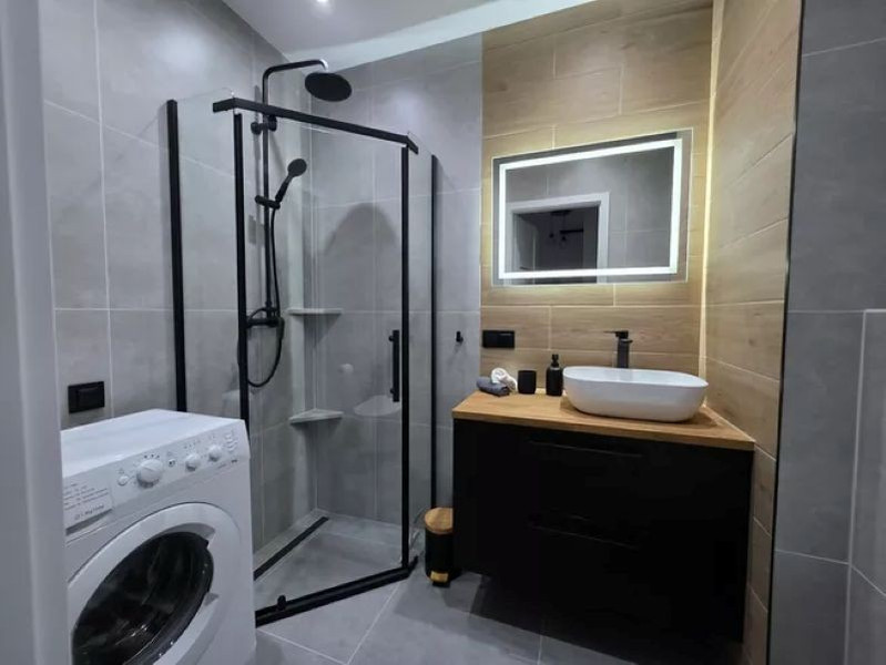 Łazienka została wyposażona w prysznic z deszczownicą oraz pralkę. Posiada również pojemną szafkę pod umywalką.