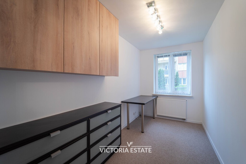 Dla osób pracujących zdalnie przygotowano osobny pokój do pracy (gabinet / home office) wyposażony w biurko, duże szuflady IKEA oraz szafy podwieszane. O kwestię przechowywania nie musisz się martwić, ponieważ mieszkanie wykorzystuje każdy centymetr przestrzeni: w przedpokoju stoi ogromna szafa (210 cm szerokości, 60 cm głębokości, 240 cm wysokości), strefa RTV to dodatkowe szafki, a w obu pokojach zamontowano pojemne szafy podwieszane pod sufit. Do dyspozycji masz również balkon, idealny na poranną kawę, oraz łazienkę z prysznicem, pralką, toaletą, umywalką i grzejnikiem drabinkowym. Na wyposażeniu znajduje się też odkurzacz, a o ciepło dba ogrzewanie gazowe.