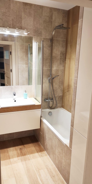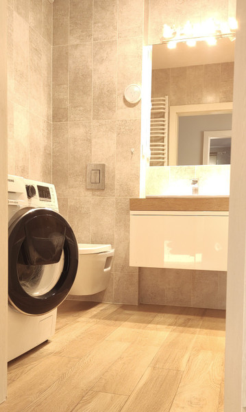 - łazienka z wanną, toaletą, pralką, umywalką i zabudowaną szafką