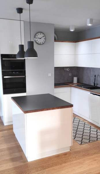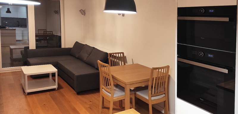 - salonu z w pełni wyposażonym aneksem kuchennym (lodówka z zamrażalką, płyta indukcyjna, zmywarka, piekarnik, mikrofala). W salonie rozkładana sofa, szafka RTV, stół z krzesłami, wyjście na balkon