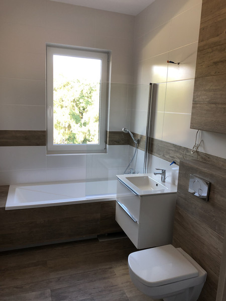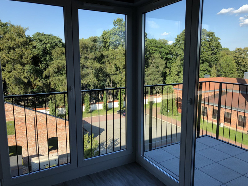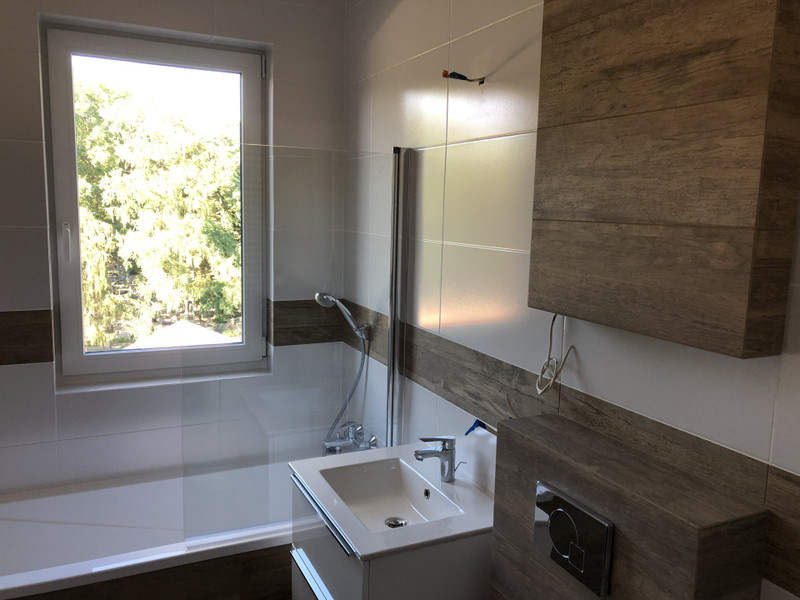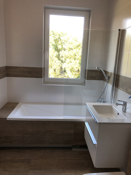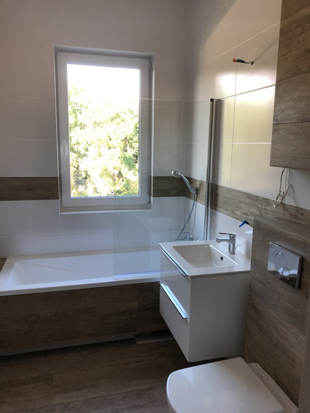 Jasna łazienka z oknem, widok na tereny zielone na zewnątrz kompleksu, balkon. Umowa na min 12mcy.