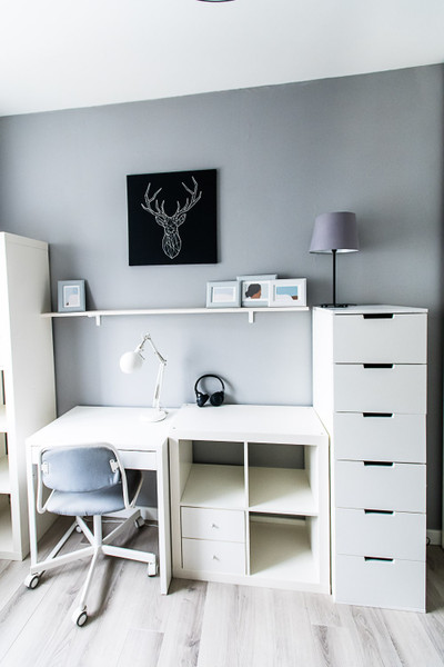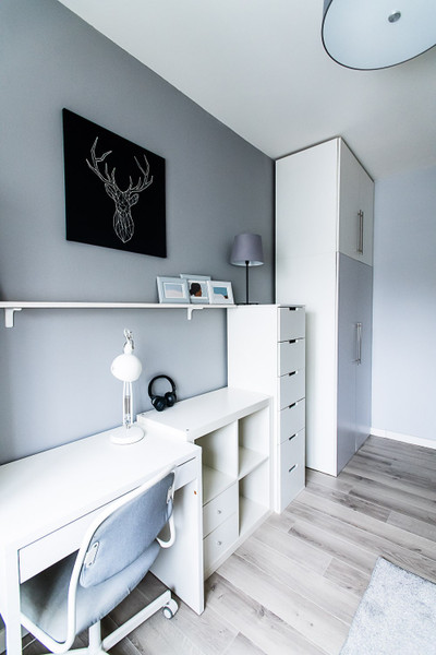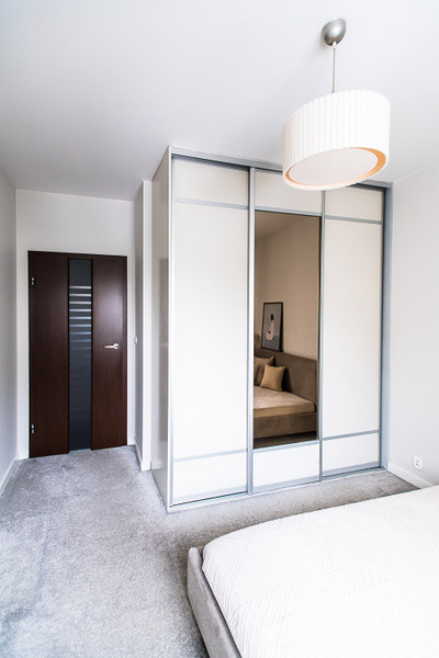 • przytulna sypialnia z dużą szafą w zabudowie,