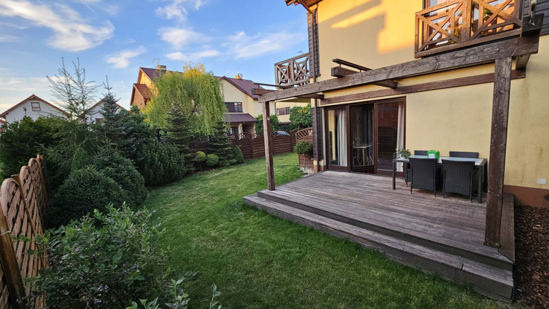 Atutem nieruchomości jest prywatny ogród o powierzchni 200 m² z tarasem około 20 m², wyposażonym w zadaszenie z automatycznymi roletami oraz zestaw wypoczynkowy ze stołem i krzesłami. Na terenie ogrodu znajduje się również drewniany domek o powierzchni 9 m², idealny do przechowywania rowerów i sprzętu ogrodowego. Trawnik posiada automatyczny system podlewania.
