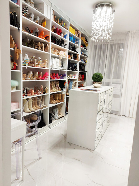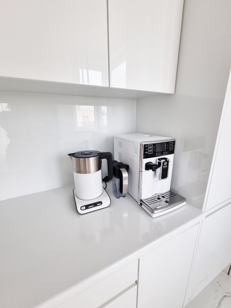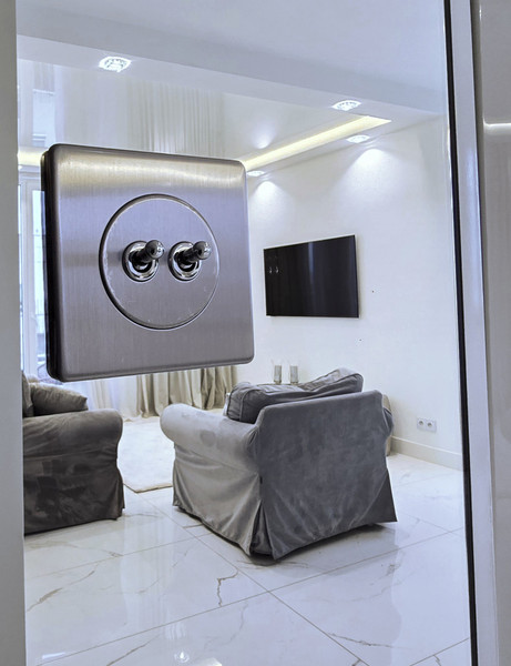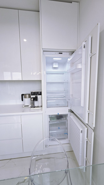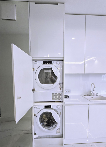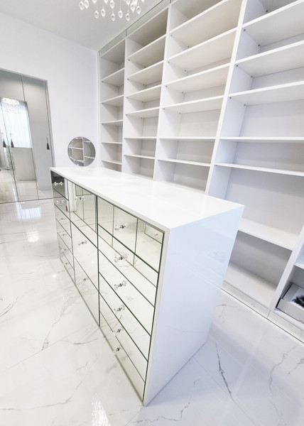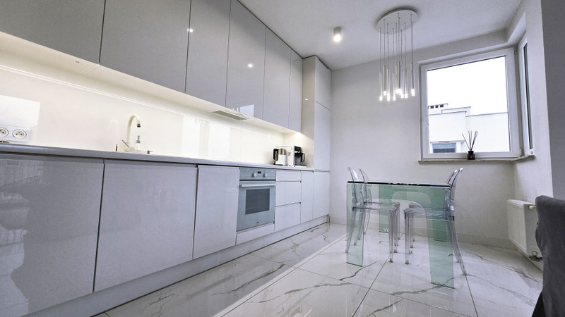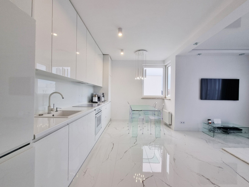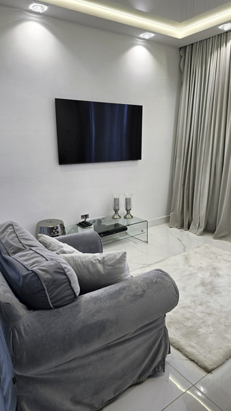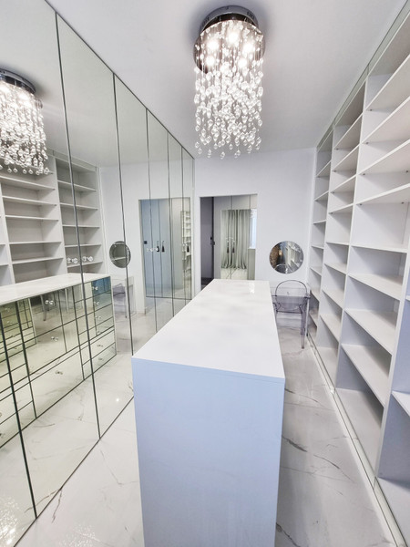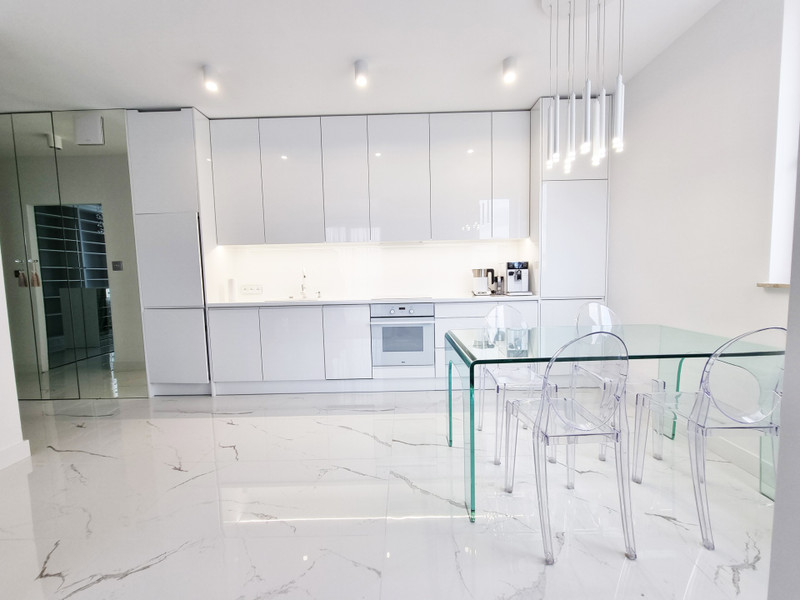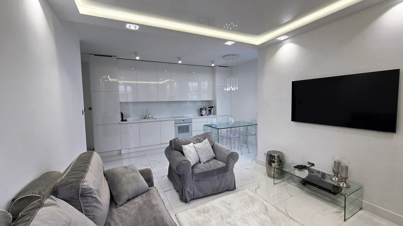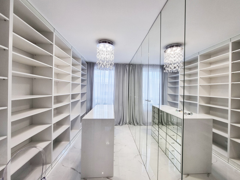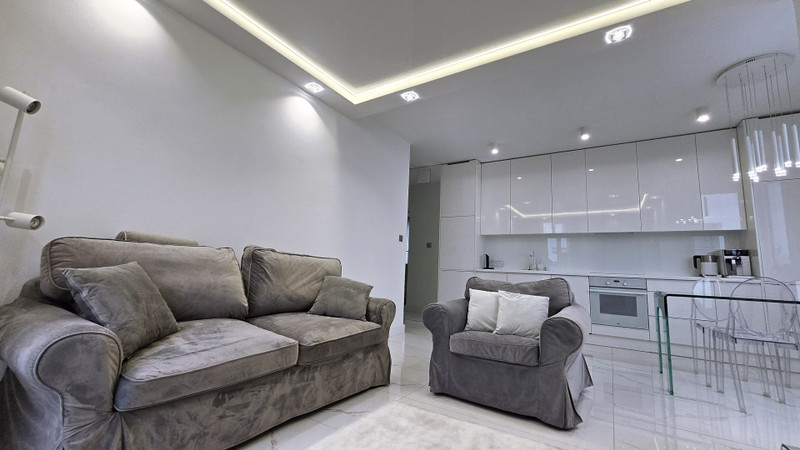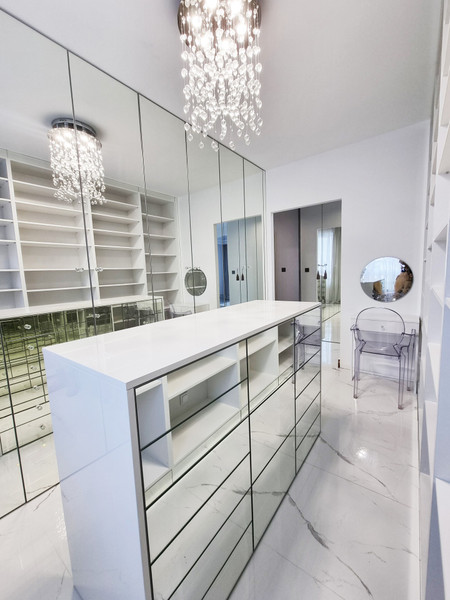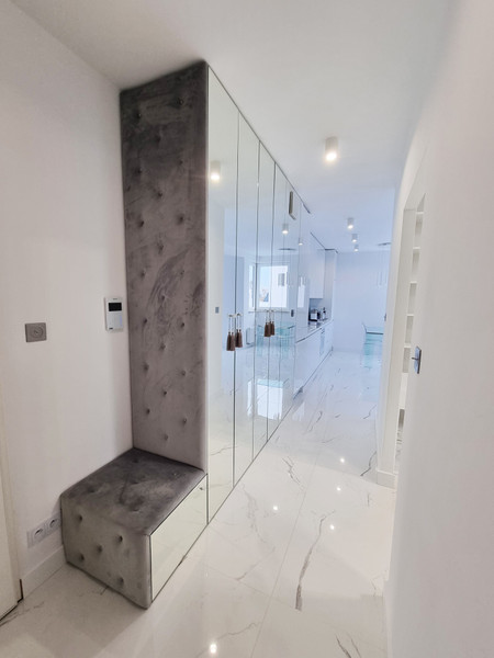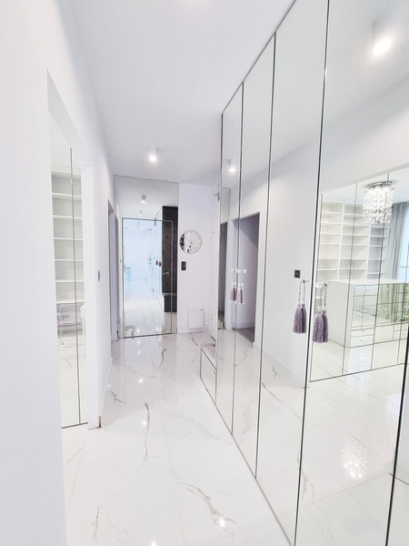 Mieszkanie wykończone w wysokim standardzie z podwieszanym sufitem z efektem lustrzanym.