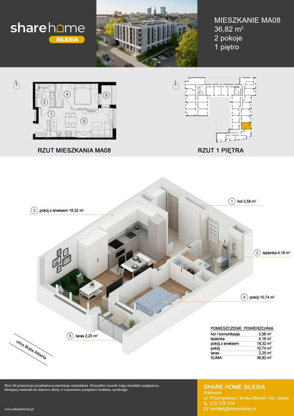 Lokal mieszkalny zlokalizowany jest w budynku Share Home Silesia, który znajduje się w centrum Katowic -> przy ul. Św. Jacka, ul. Brata Alberta oraz ul. Przemysłowej -> bliskość uczelni wyższych,