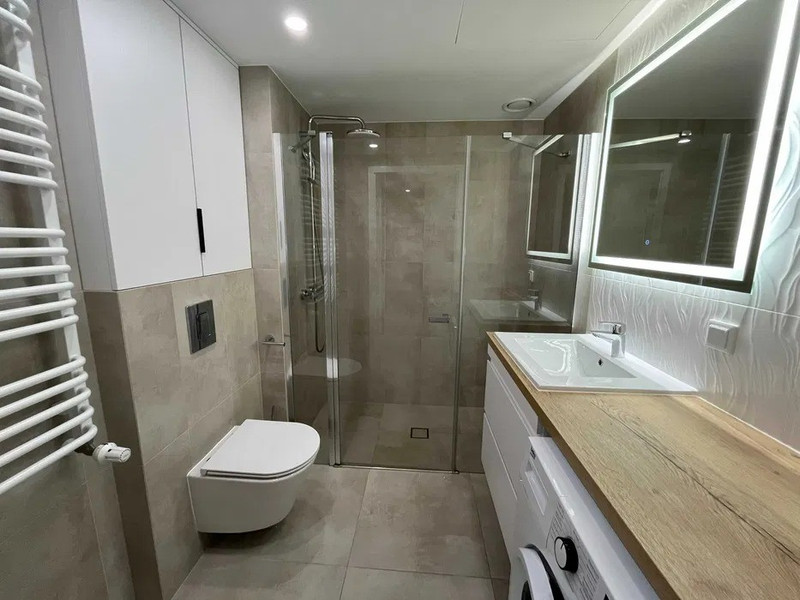 4. Łazienka - z umywalką, prysznicem, szafkami, wc, pralką w zabudowie i podświetlanym lustrem.