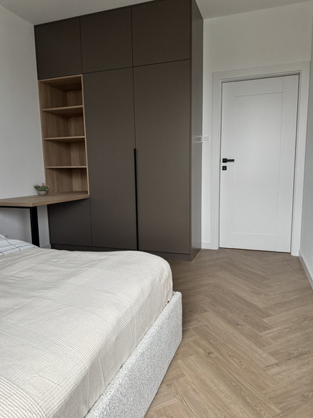 Jasna sypialnia z funkcjonalną szafą i miejscem do pracy,