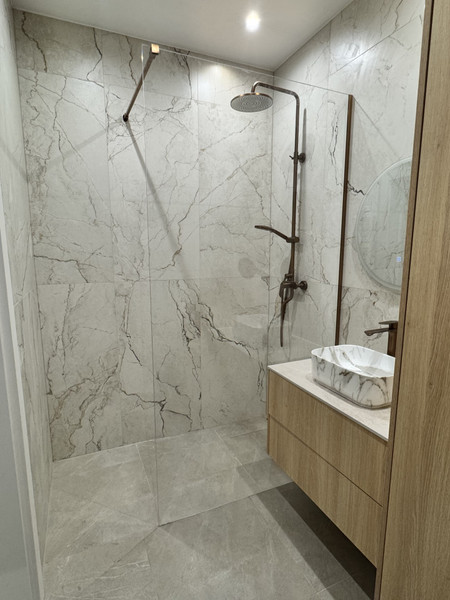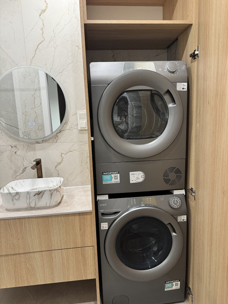 Komfortowa łazienka z prysznicem walk- in, umywalką, wc, pralką i suszarką zainstalowaną w zabudowie.