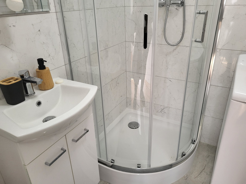 Łazienka wyposażona jest w prysznic oraz pralkę.