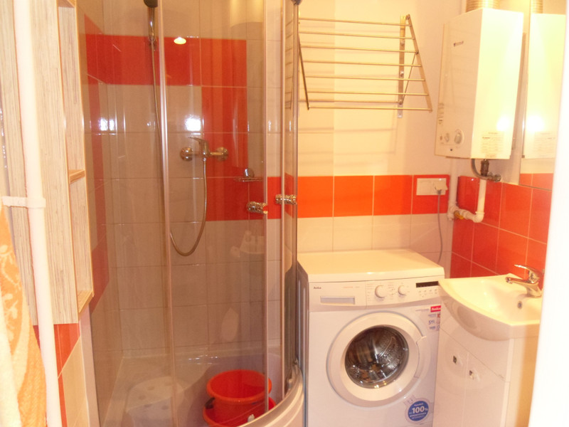 Łazienka jest po remoncie z nową kabiną prysznicową i nową pralką.