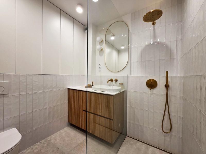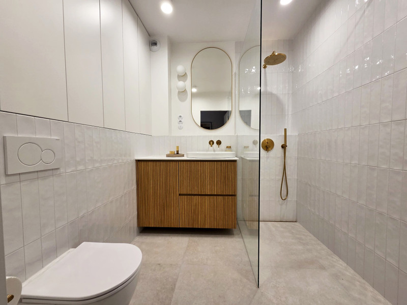 • przestronna łazienka z prysznicem typu walk-in, wyposażona w zabudowy stolarskie (3 szafki wnękowe) oraz pojemną komodę z koszem na pranie