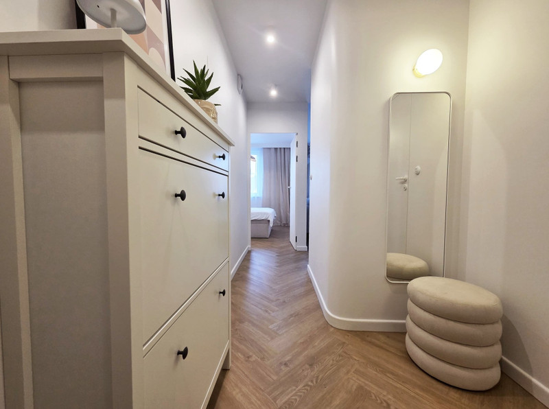 Zdecydowana większość mebli została wykonana na zamówienie przez stolarza. Wszystkie sprzęty AGD i RTV są nowe (z wyjątkiem pralki), a mieszkanie nie było wcześniej wynajmowane po remoncie.