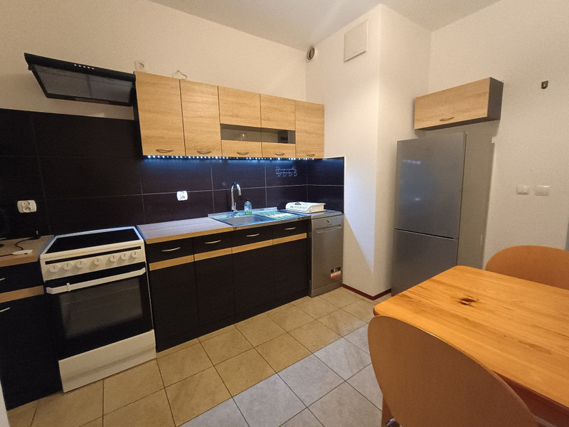 Kuchnia jest w pełni wyposażona: znajdują się w niej kuchenka elektryczna z piekarnikiem, lodówka, zmywarka. W łazience znajdują się prysznic oraz pralka automatyczna.