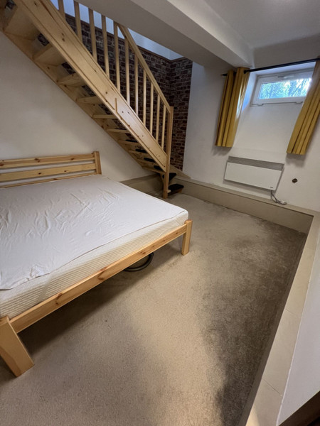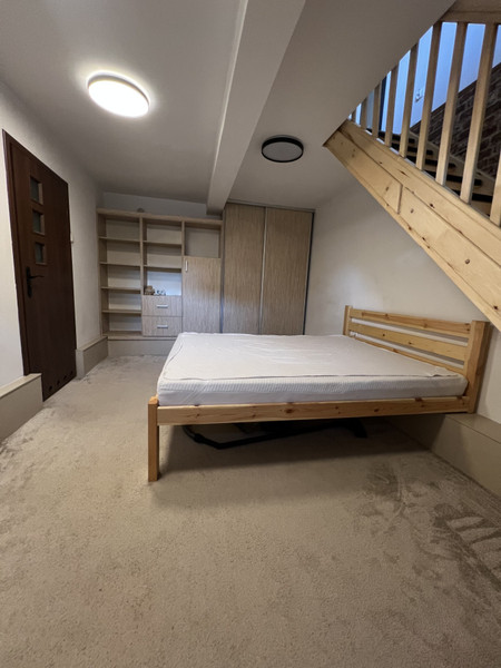 2) w przyziemiu/niskim parterze z oknem, znajduje się sypialnia z zabudową i łazienka