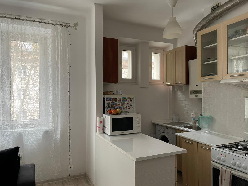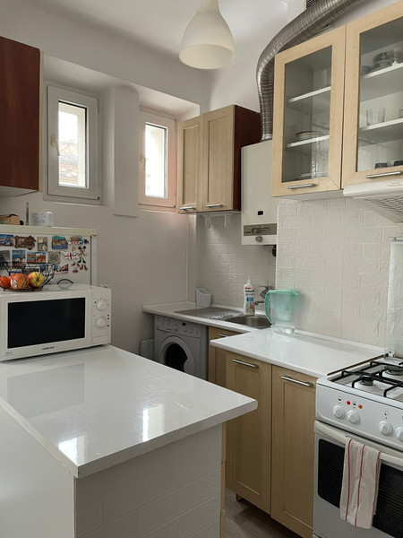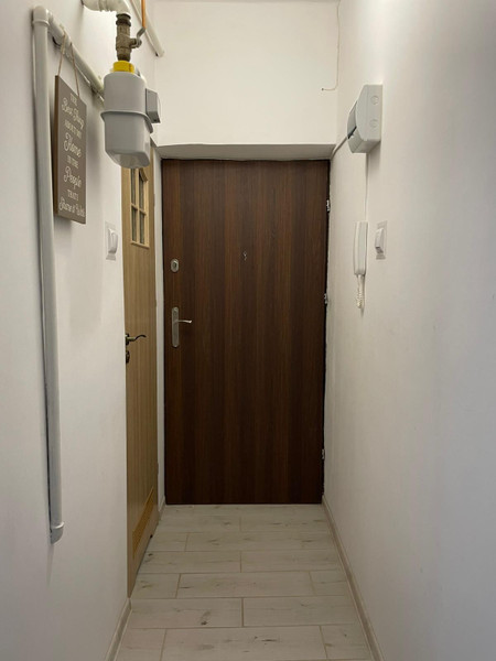 Mieszkanie jest umeblowane. Kuchnia w aneksie jest zabudowana na wymiar szafkami wraz z pralką, lodówką i piecem gazowym do podgrzania ciepłej wody. Łazienka z oknem wypłytkowana, wyposażona w prysznic.