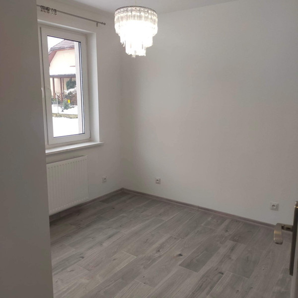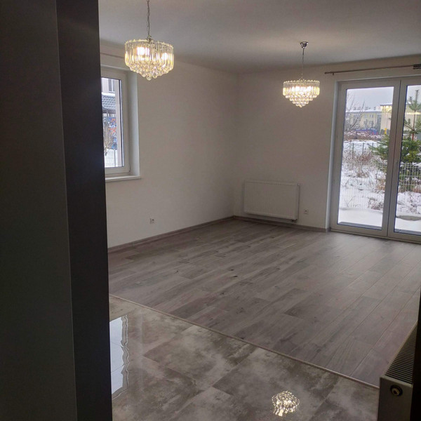 Ściany w gładzi pomalowane na biało. Na podłogach w salonie i pokojach są położone wysokiej klasy panele. W przedpokoju oraz w łazience nowoczesne jasne płytki. Tapeta na ścianie w salonie. W