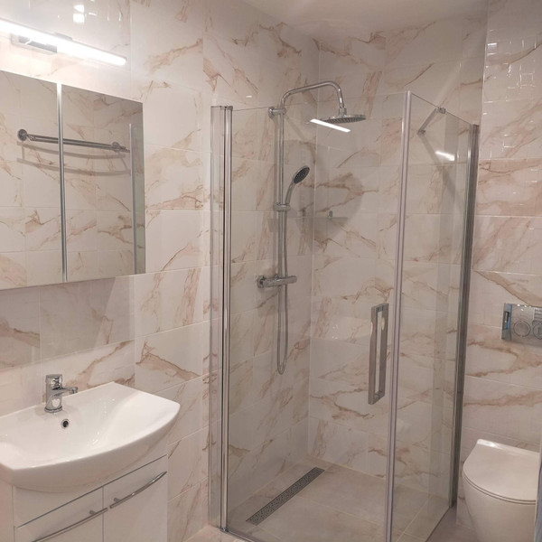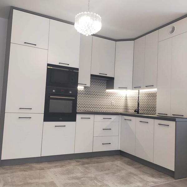 Kuchnia urządzona nowocześnie z meblami i sprzętem AGD (chłodziarko zamrażarką, płytą indukcyjną, mikrofalówką, piekarnikiem, zmywarką, okapem). Komfortowa łazienka z kabiną prysznicową oraz zestawem ubikacyjnym Geberit.