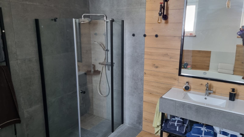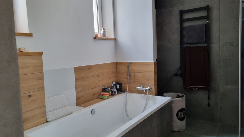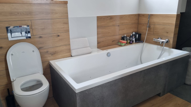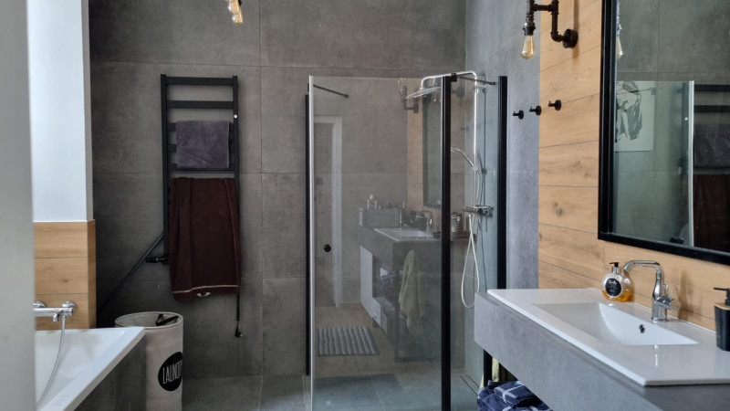 • łazienka z bardzo dużą wanną i kabina prysznicową,