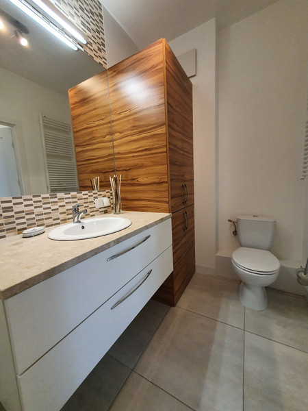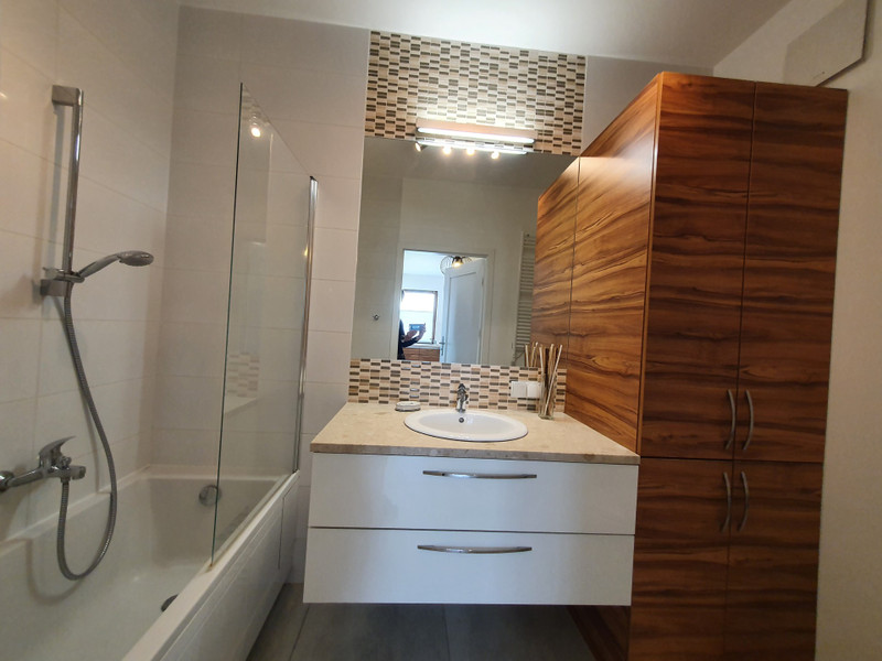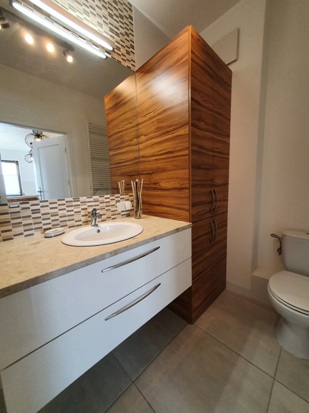 - łazienki z wanną i prysznicem. W łazience znajduje się pralko-suszarka oraz pojemne szafki.
